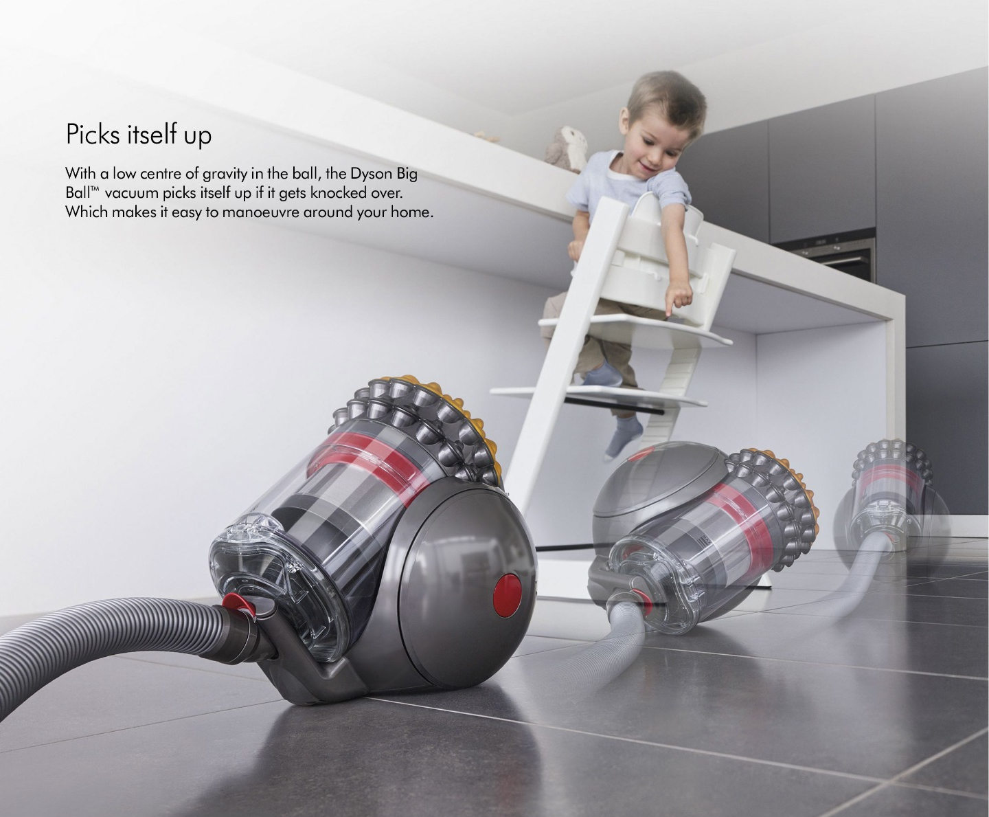 | Features | Picks itself up when knocked over: Only Dyson Big Ball™ cylinder vacuums pick themselves upHygienic bin emptying: Drives out trapped dirt, so there's no need to touch it2 Tier Radial™ cyclones: two tiers of cyclones generate high centrifugal forces to capture microscopic dust and allergensNew self-adjusting Pneumatic cleaner head: automatically self-adjusts to seal in suction across all floors - no need to change cleaner heads |