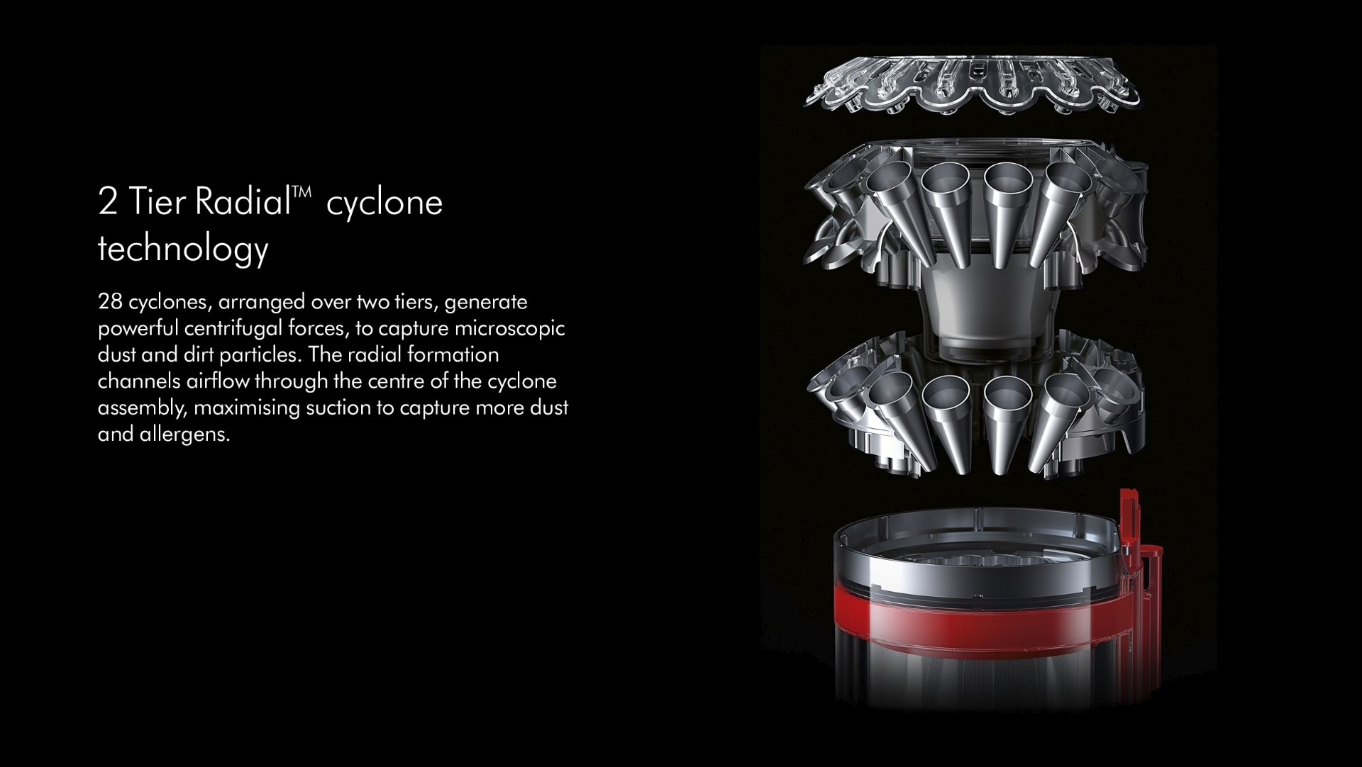 With Dyson's pneumatic cleaner surface recognition sensor, it allows the head to raise and lower depending on the floor type keeping suction to it's maximum, combined with the force generated by their Radial Root Cyclone technology, it can even capture microscopic dust and allergens.