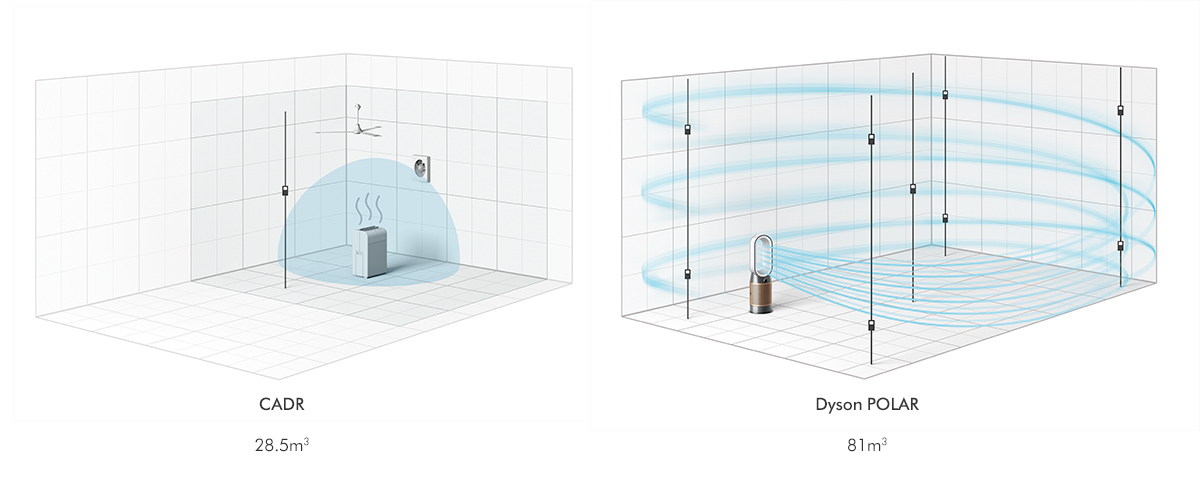 Tested beyond CADR, for real living spacesAs you can see, Dyson purifier testing exceeds the industry-standard CADR test method – to better a reflect real home environment.