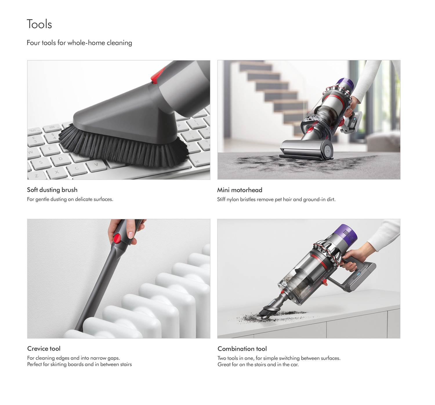 Are your sofas and chairs in need of a freshen up? The V10ANIMAL works on upholstery too, and if you need to pick up stubborn pet hairs, it's perfectly suited to homes with furry friends. This vacuum cleaner even changes to a handheld to clean your stairs or car - with stainless steel tubes and four cleaning tools to reach every corner. These are the Mini Motorhead, Combination Tool, Crevice Tool, and Mini Soft Dusting Brush.