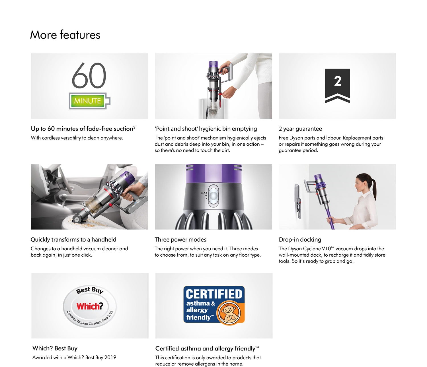 | Features | Direct Drive cleaner head deep cleans carpets and hard floorsA bigger bin for the big cleansChanges to a handheld in once click with 4 cleaning tools for the stairs, upholstery and car < Advanced cyclone technology for no loss of suctionCertified asthma and allergy friendly™ with advanced whole machine filtrationthree power modes to suit any taskHygienic point-and-shoot bin emptying |
