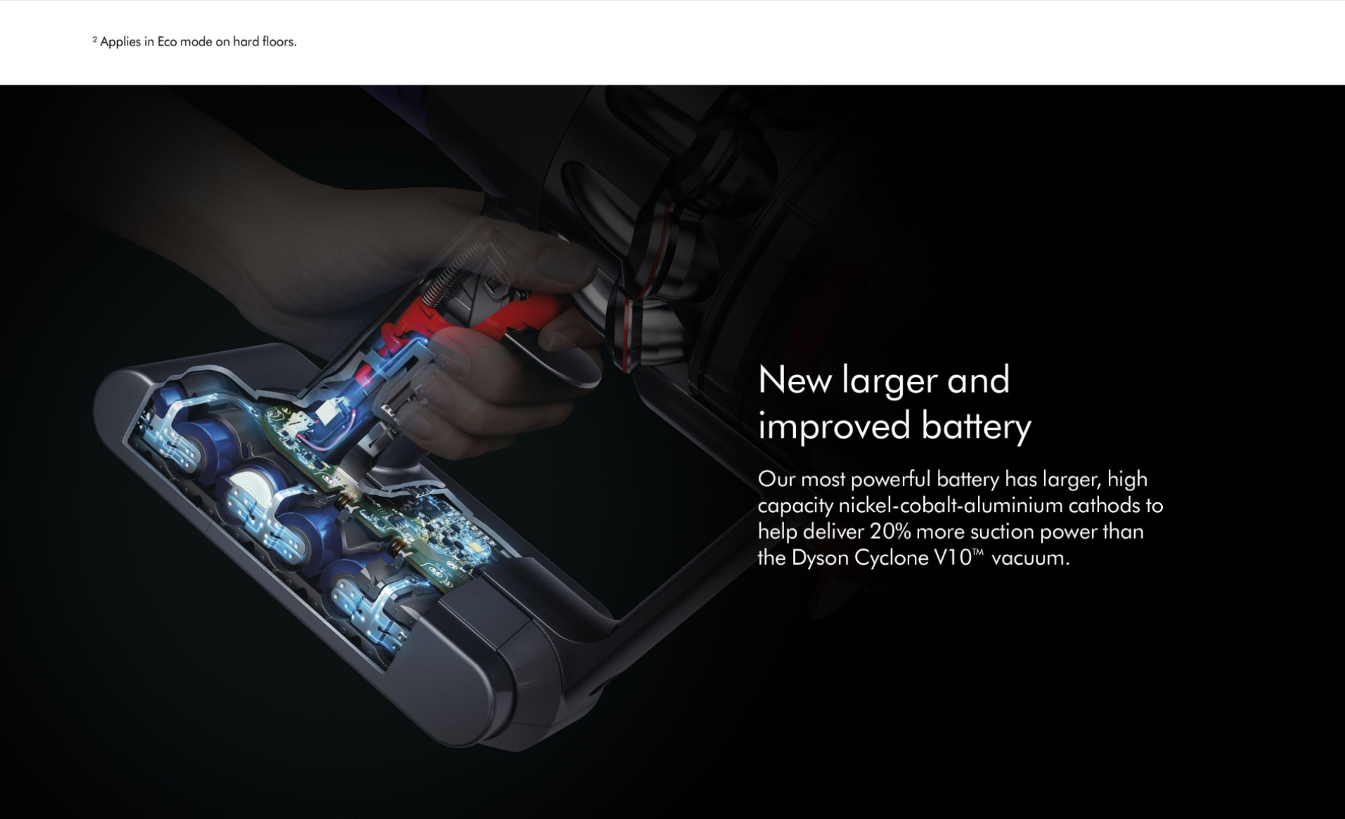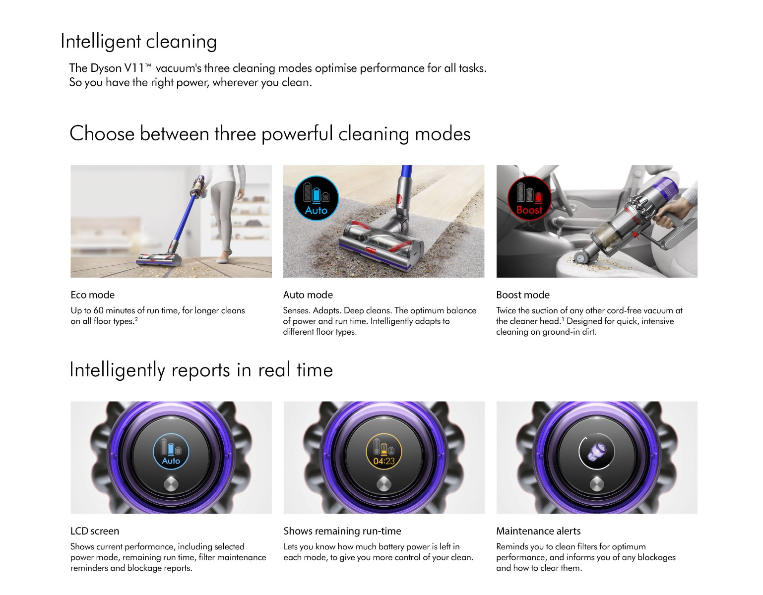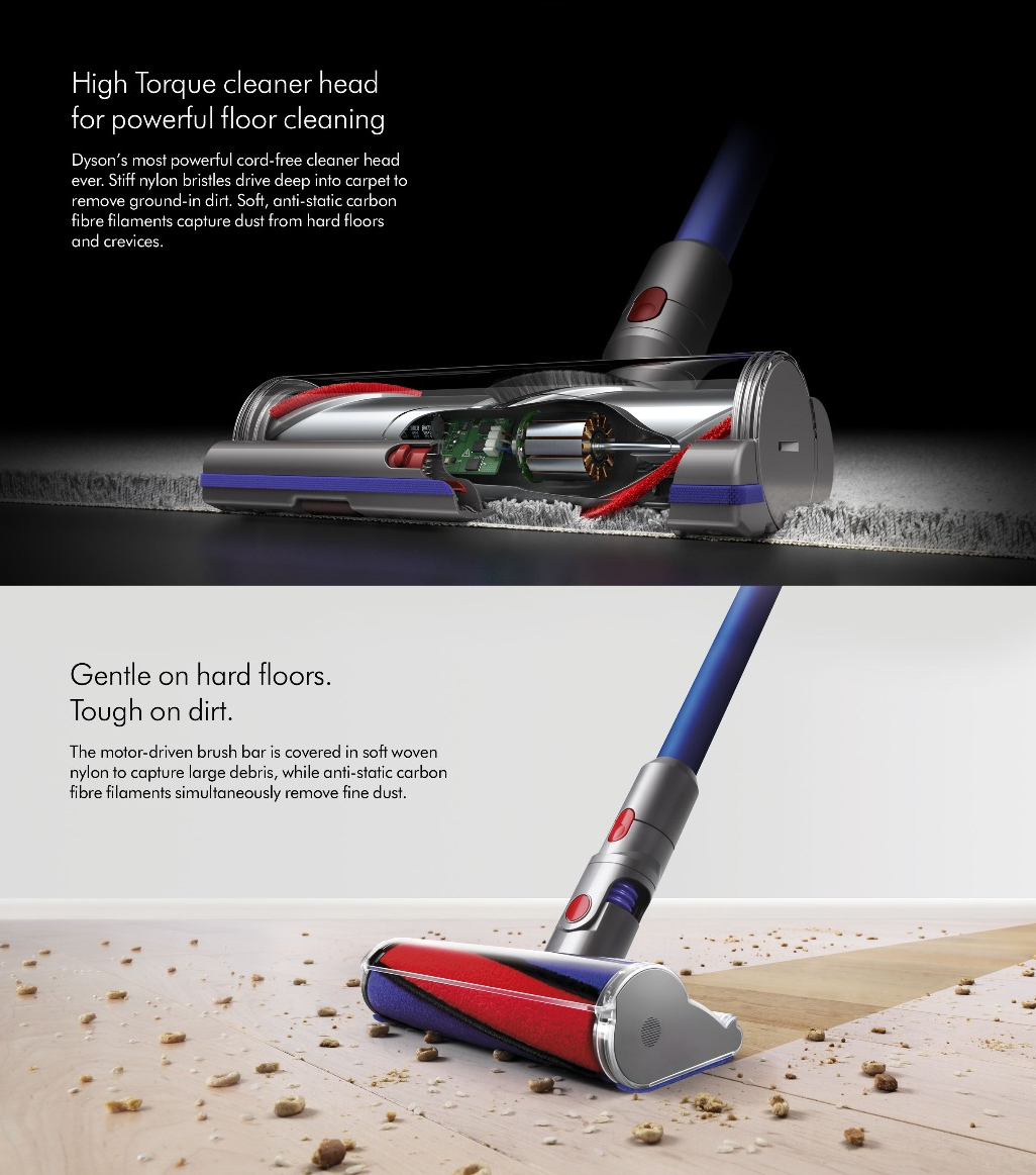 | Features | - Dynamic Load Sensor™ technology in the Torque Drive cleaner head automatically optimises suction to suit different floor types- New LCD screen display shows the run time and performance of your vacuum- Swappable, energy dense battery pack - one batter included for up to 60 minutes fade-free floor cleaning²- A bigger bin for the big cleans- Changes to a handheld in one click with 4 cleaning tools for the stairs, car or upholstery- Three power modes to suit any task- Hygienic point-and-shoot bin emptying |