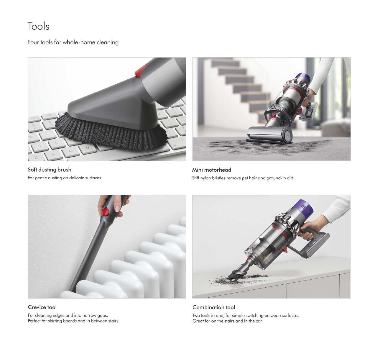 With only one click, it changes to a handheld model too, giving you ultimate vacuuming flexibility for your stairs or car. Youll also find included tools to enhance your cleaning the Mini Motorhead, Combination Tool, Crevice Tool and Mini Soft Dusting Brush. Or, use the stainless steel tubes to pick up hidden dirt high-up or down-low.